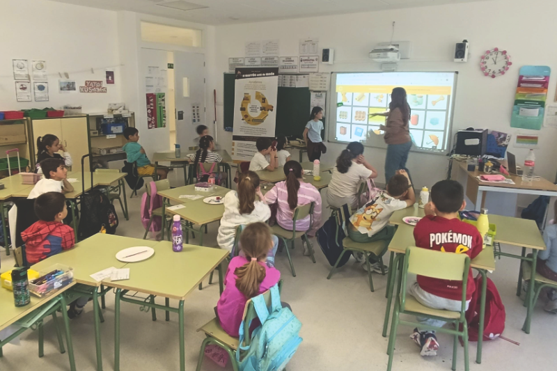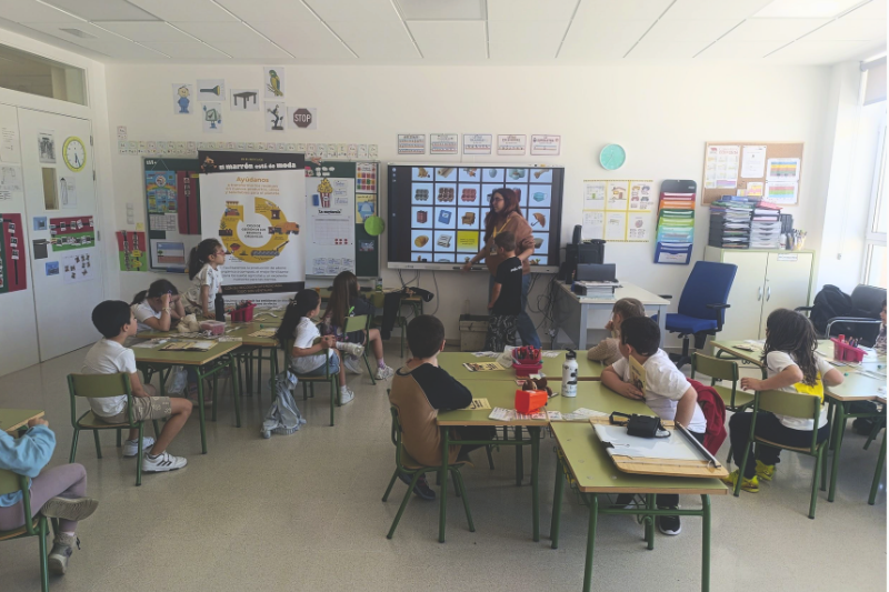 Tras este primer bloque, las sesiones se centraron en el repaso de los diferentes contenedores de reciclaje, con especial atención al contenedor marrón. Para reforzar lo aprendido, los niños y niñas participaron en dinámicas lúdicas como el uso del “buscador de reciclaje”, una herramienta interactiva que les permitió identificar correctamente dónde depositar cada residuo.
